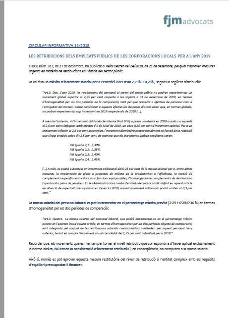 CIRCULAR INFORMATIVA 12/2018 LES RETRIBUCIONS DELS EMPLEATS PÚBLICS DE LES CORPORACIONS LOCALS PER A L’ANY 2019